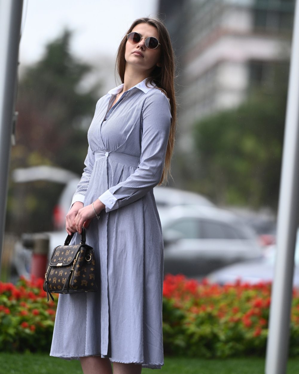 Fustan me vija dhe jakë klasike, i theksuar me kopsa në bel – kombinim perfekt mes elegancës dhe stilit të përditshëm.