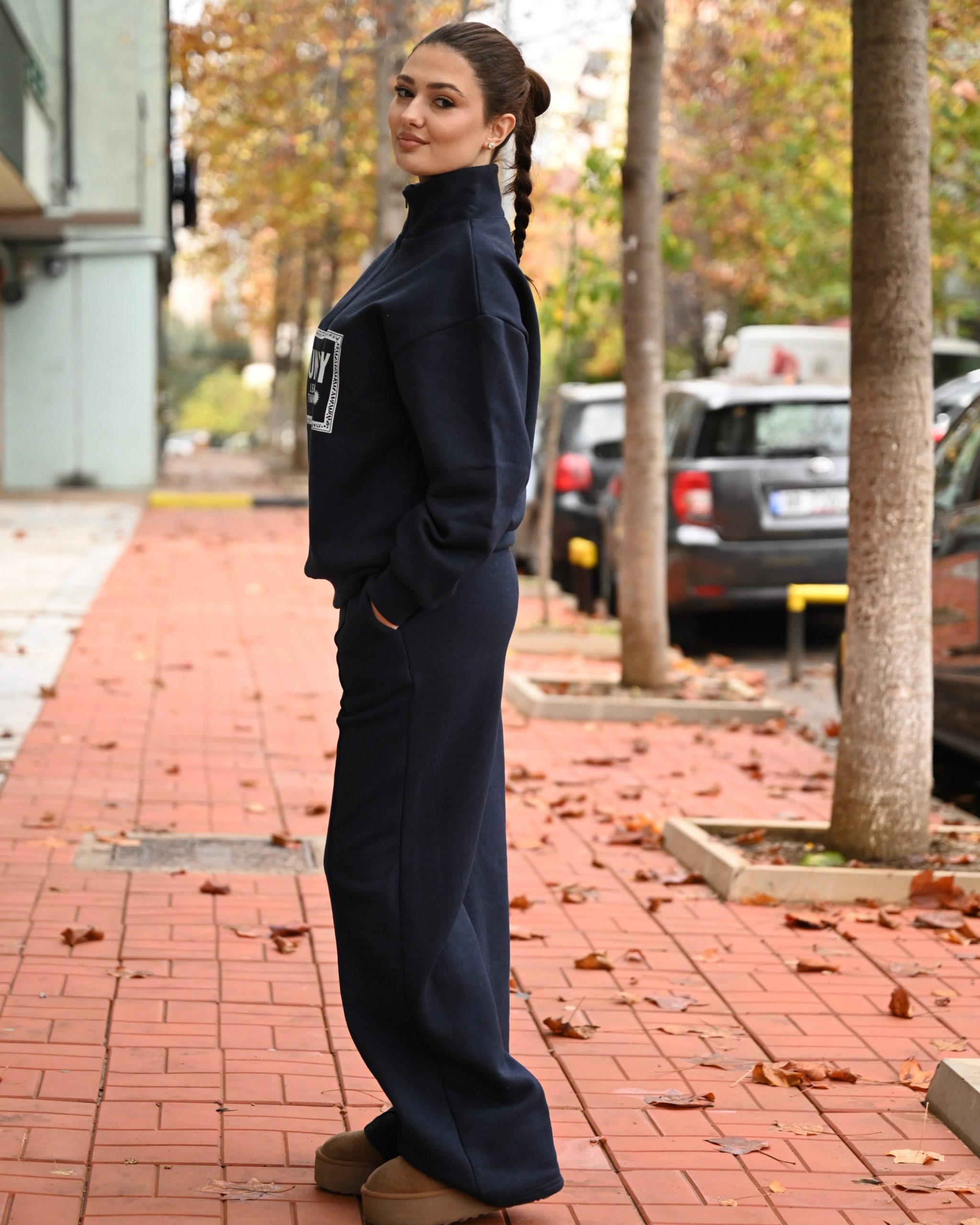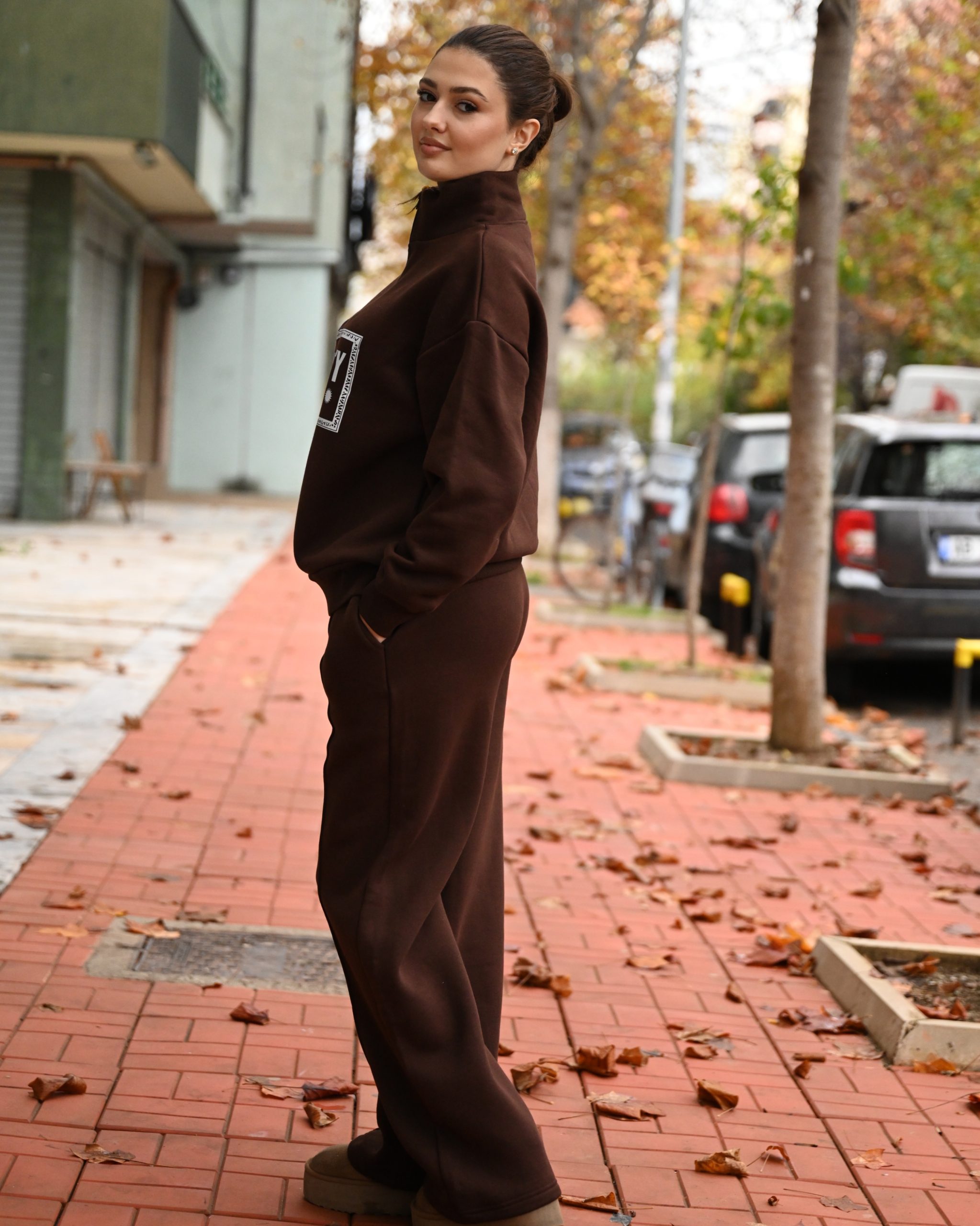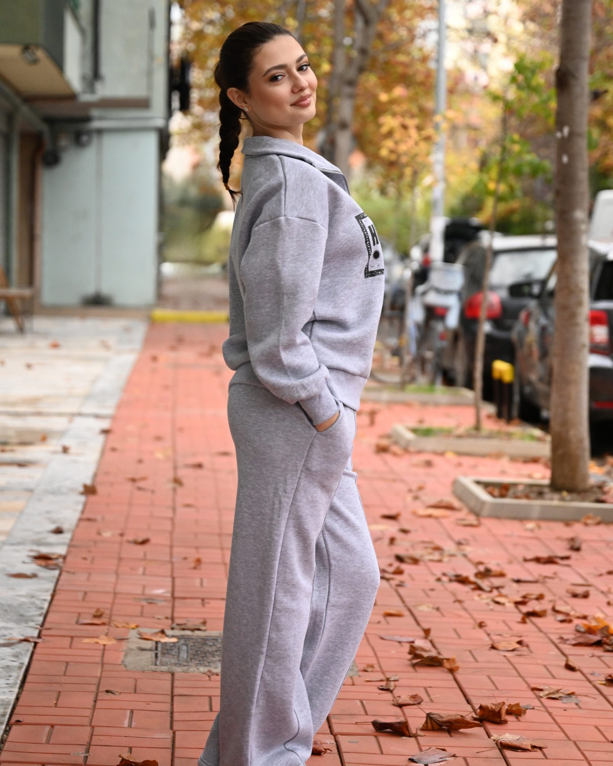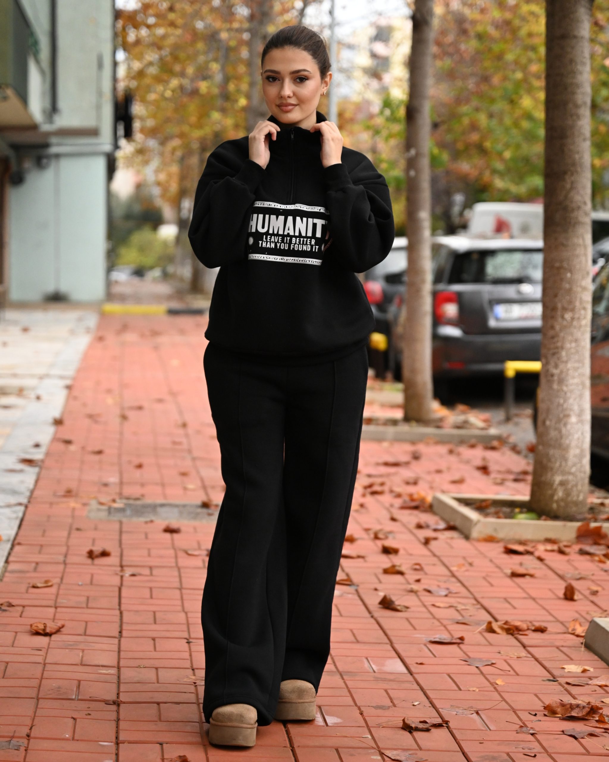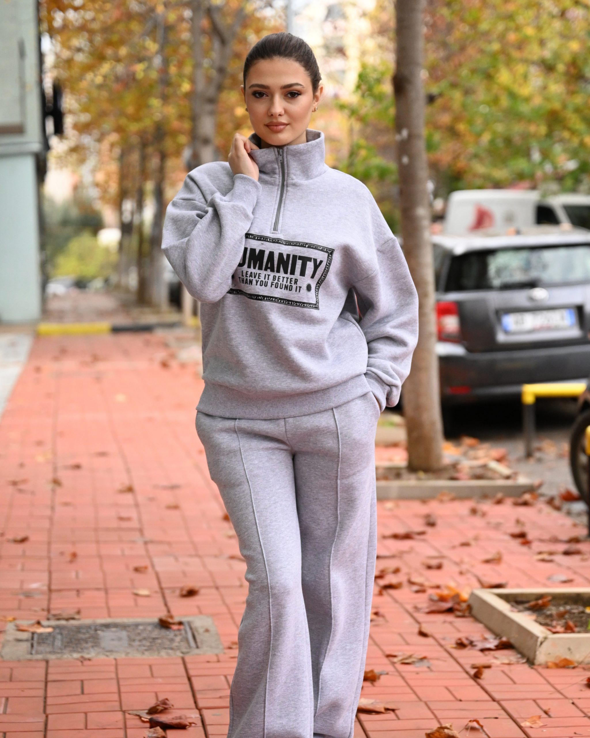 Set sportiv me tuta dhe bluze me zinxhir, prerje oversize. Tutat jane me llastik ne bel dhe xhepa. Material pambuku, i ngrohte dhe ideal per perditshmeri.