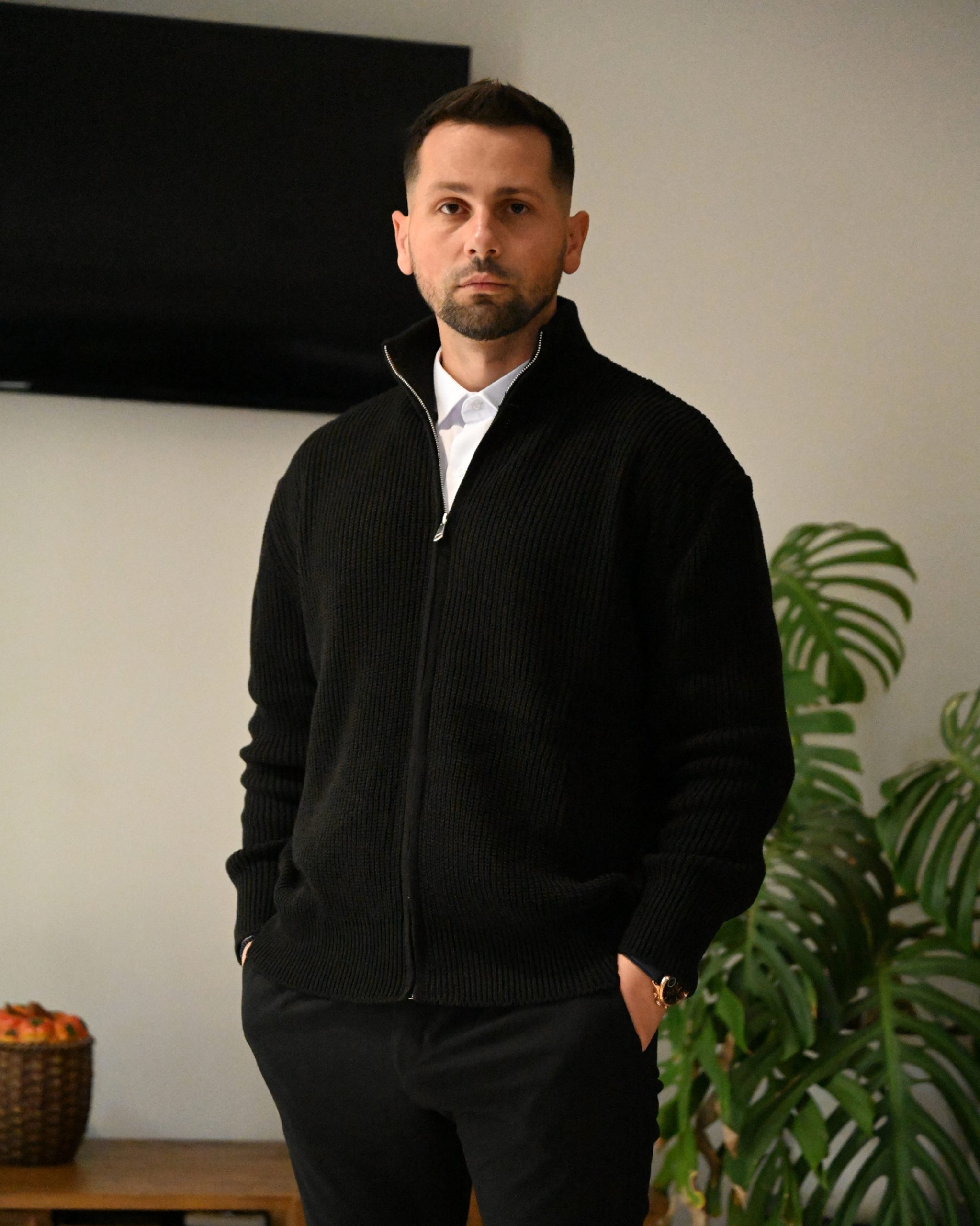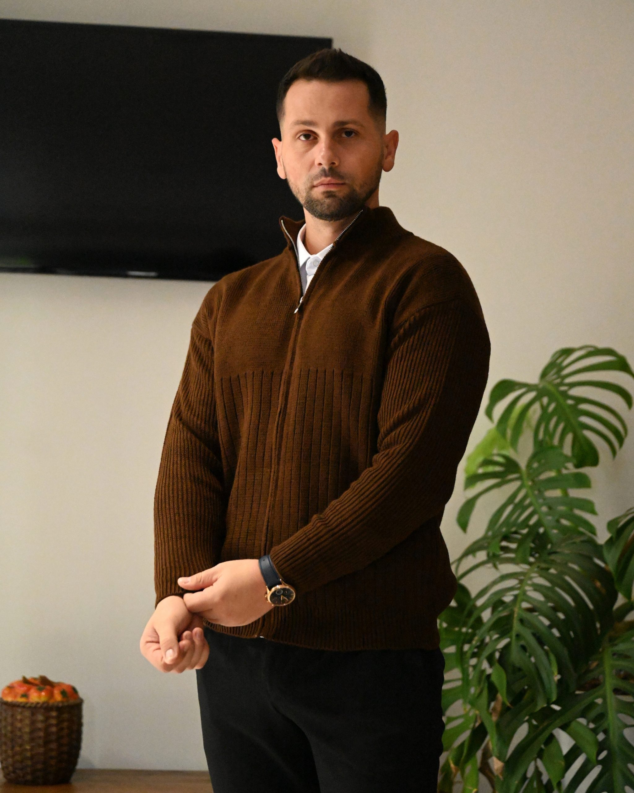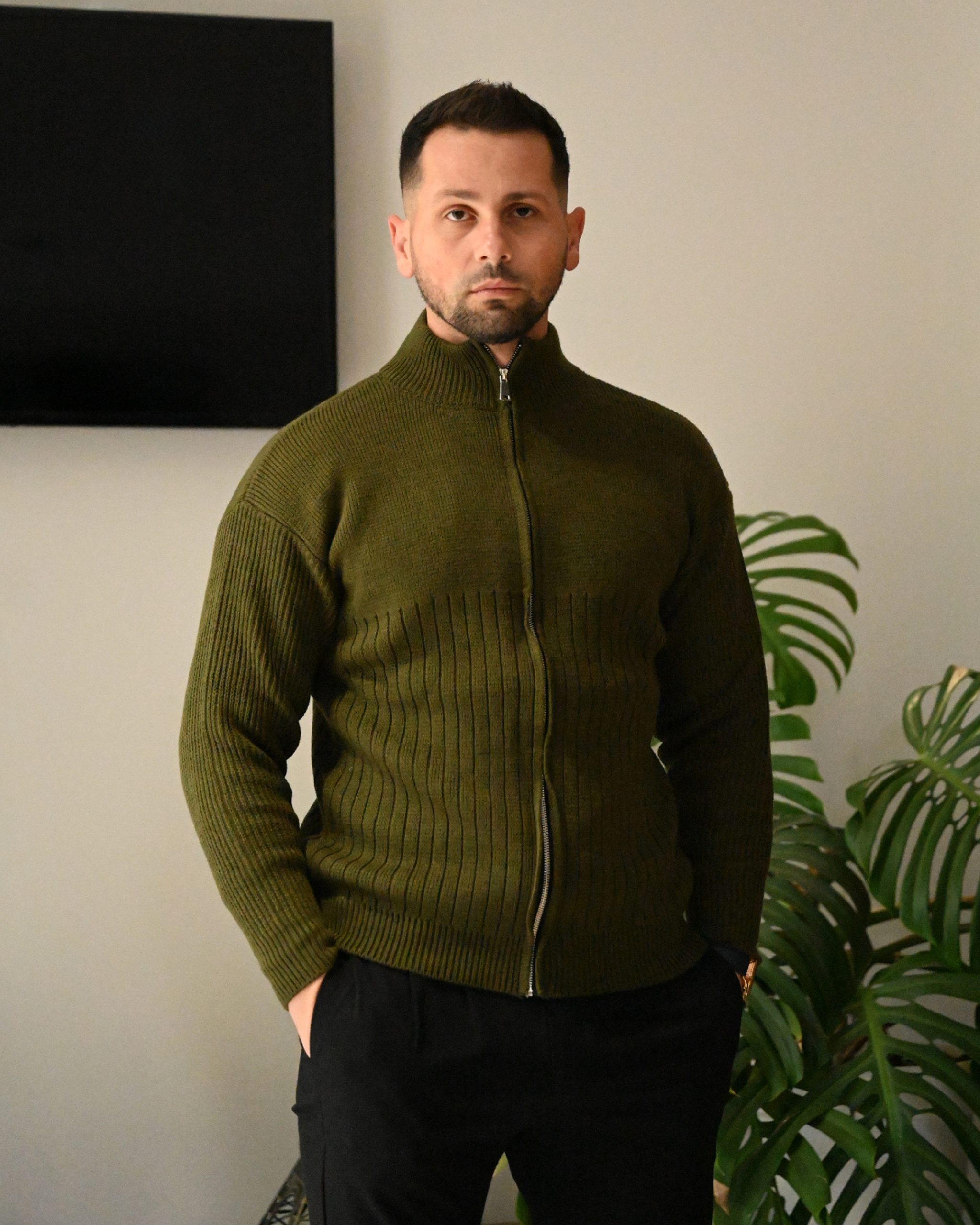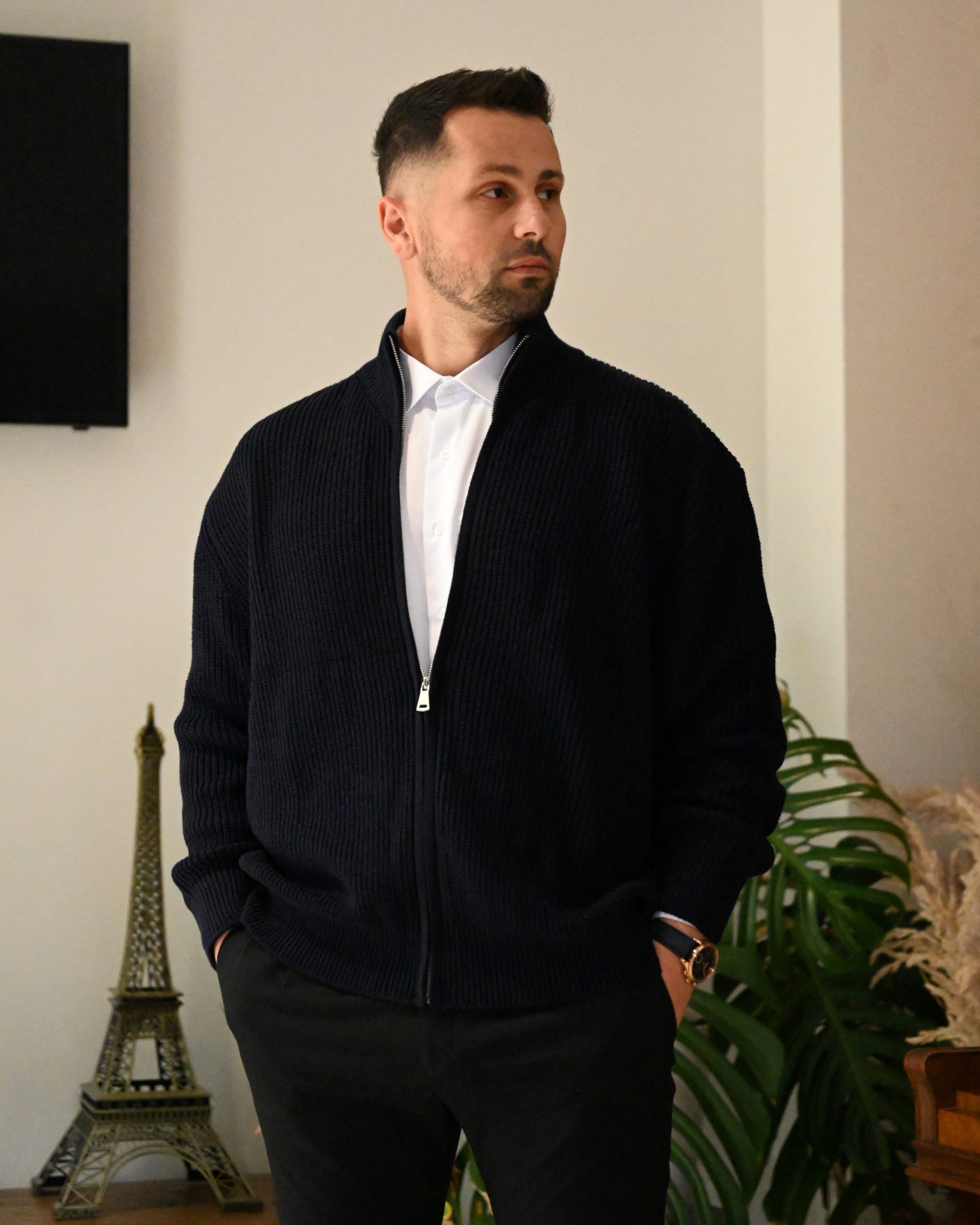 Kjo triko për meshkuj me zinxhir është elegante dhe e ngrohtë, ideale për ditët e ftohta. Materiali cilësor siguron rehati maksimale, ndërsa zinxhiri i shton stil dhe funksionalitet. Kombinohet lehtë me këmishë ose bluzë për një look modern.