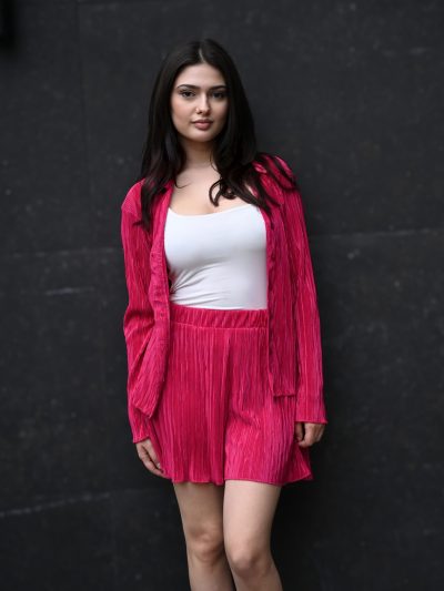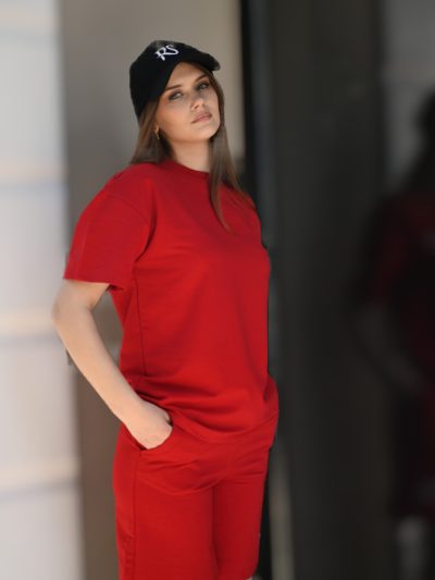 Set pambuku me bluzë dhe pantallona të shkurtra, i lehtë dhe i rehatshëm për ditët e ngrohta. Materiali është i freskët dhe i butë në prekje. Vjen në disa ngjyra: e kuqe, e zezë, gri dhe e bardhë.